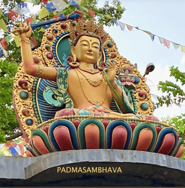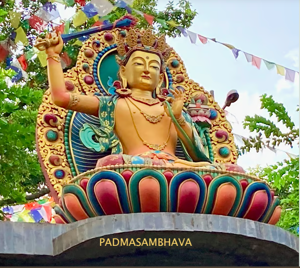 Do lado direito está Padmasambhava, Guru Rinpoche, o Precioso Mestre, um dos mais reverenciados mestres da tradição budista Vajrayana, budismo tibetano.