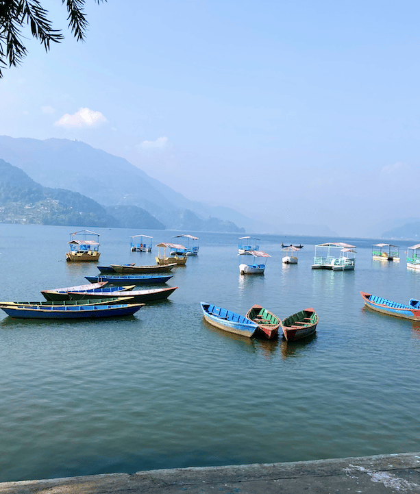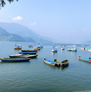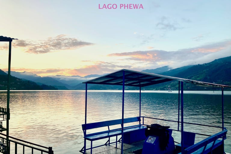 Lago Phewa, uma hora de passeio de barco pelo tranquilo Lago Fewa, cercado de matas e montes de um lado, e pela cidade e as montanhas do outro, esse sereno lago reflete as montanhas em volta e nos convida a relaxar e apreciar mais a natureza. Visita ao templo de Talbarahai, que fica na pequena ilha no meio do lago.